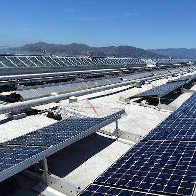 The three of them follow the ranger into a dark stairwell and up a few stories on a metal stairway. Then they walk out into the bright daylight to find a flat rooftop covered with solar panels. She’s confused by this for a moment—is this what they came to see?—but then she realizes that the view from up there is extraordinary. She can see everything, with a 360-degree, bird’s eye view of the entire north bay. There’s the Golden Gate bridge leading out to the Pacific Ocean to the west, Marin County, with the Tiburon peninsula and Angel Island to the north, and the green hills of the Berkeley and Oakland to the east. And on this mist-free day, it’s all so clear that even subtle gradations of color are visible from a distance.
